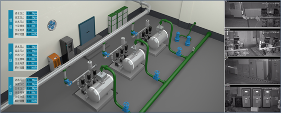 二供管理平台集成泵房工艺图、供水实时数据、门禁状态和视频监控,全方位掌控泵房现场情况,实现泵房防入侵和自调解。