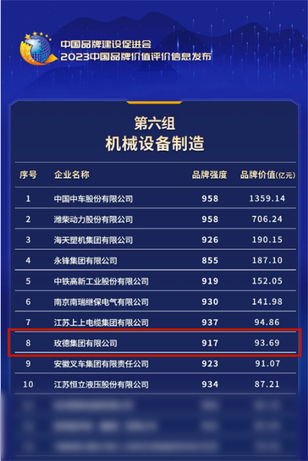 玫德集团在“机械设备制造组”荣获第八名,品牌强度917,品牌价值93.69亿元,品牌价值由2022年的81.93亿元增长了11.76亿元。