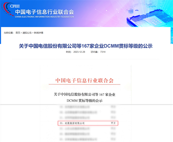 2023年12月28日,中国电子信息行业联合会发布了《关于中国电信股份有限公司等167家企业DCMM贯标等级的公示》,玫德集团有限公司成功通过了DCMM《数据管理能力成熟度评估模型》稳健级(3级)贯标认证。