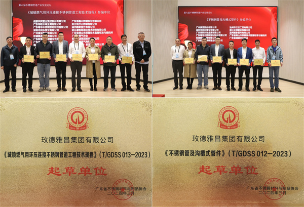论坛期间,广东省不锈钢材料与制品协会特别为《城镇燃气用环压连接不锈钢管道工程技术规程》和《不锈钢管及沟槽式管件》两项标准的审查人和起草单位颁发牌匾,以表彰在行业标准制定和技术进步上所做出的卓越贡献。玫德雅昌作为两项标准的起草单位之一,荣获嘉奖。这不仅是对玫德雅昌在行业中影响力和专业地位的肯定,也是对企业持续在产品创新和技术研发上深耕细作的鼓励。