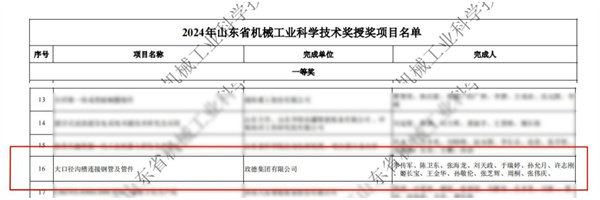 2024年09月08日,山东省机械工业科学技术协会网站下发了《关于公布2024年山东省机械工业科学技术奖的通知》,玫德集团有限公司提报的“大口径沟槽连接钢管及管件项目”荣获山东省机械工业科学技术一等奖。